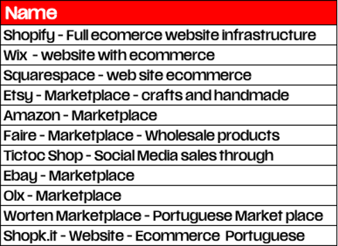 Initially we identified thirteen platforms we wanted to investigate. These include fully established marketplaces where the vendor sells on the marketplace site – Amazon, Etsy, eBay, Olx.pt. Multiple websites hosted shopping tools – Shopify, Wix, SquareSpace, Shopk.it, finally sought the newer direct plugins of Social Media markets such as TikTok Shop.